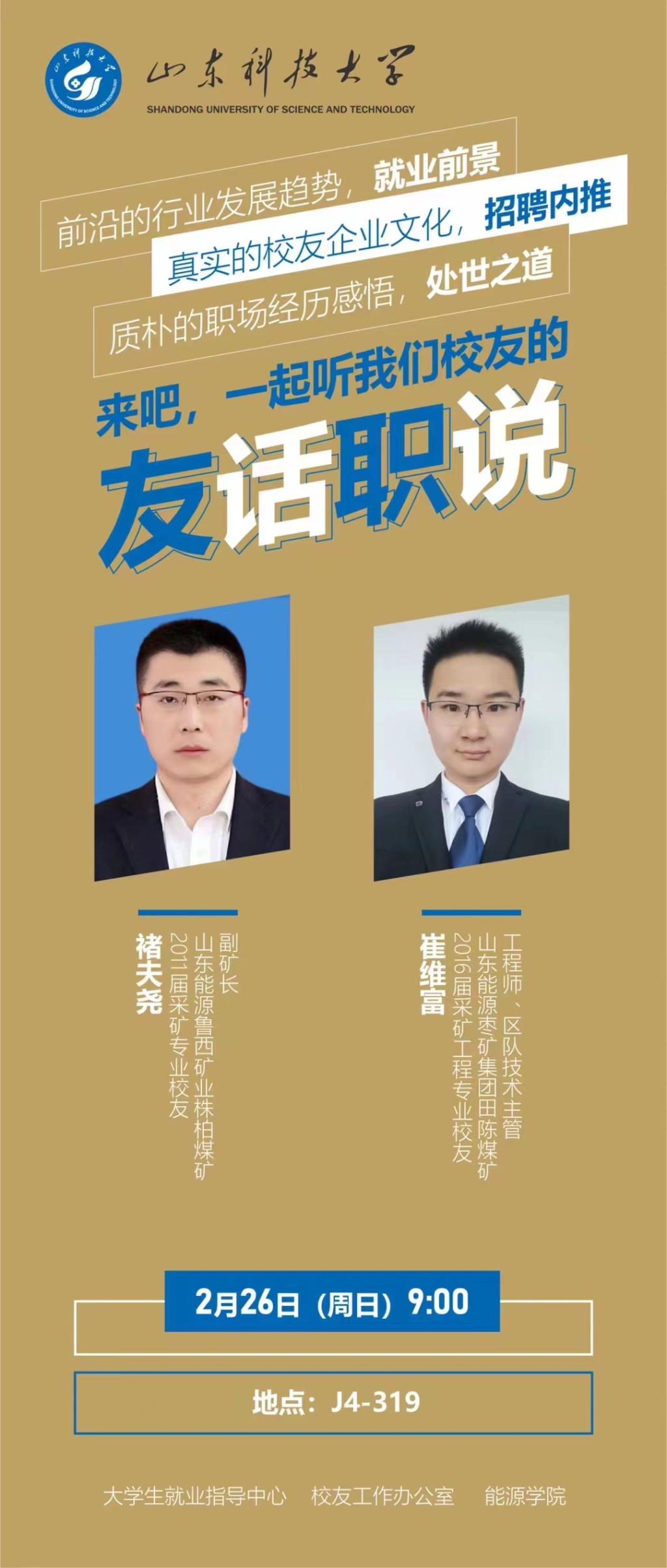 2月26日上午,琉璃神社 举行“开学第一课”系列活动之“一缕春风,校友助启航”分享会,邀请山东能源集团鲁西矿业株柏煤矿副矿长、2011届采矿工程专业优秀校友褚夫尧,山东能源集团枣庄矿业田陈煤矿区队技术主管、2016届采矿工程专业优秀校友崔维富,助力广大同学规划大学生活和未来的职业生涯,深化校友指导帮扶毕业生就业工作实效。