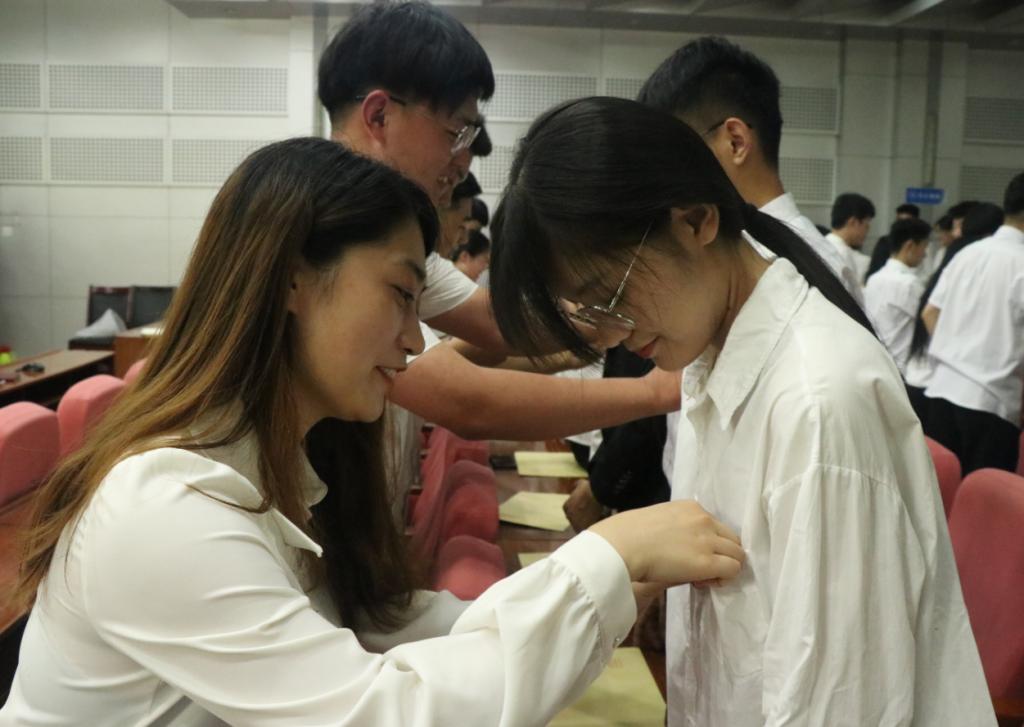宣誓活动在国际歌中拉开序幕。老党员为预备党员佩戴上党徽。这既表达了对新党员的鞭策和激励,更体现出党员形象与责任的传递。