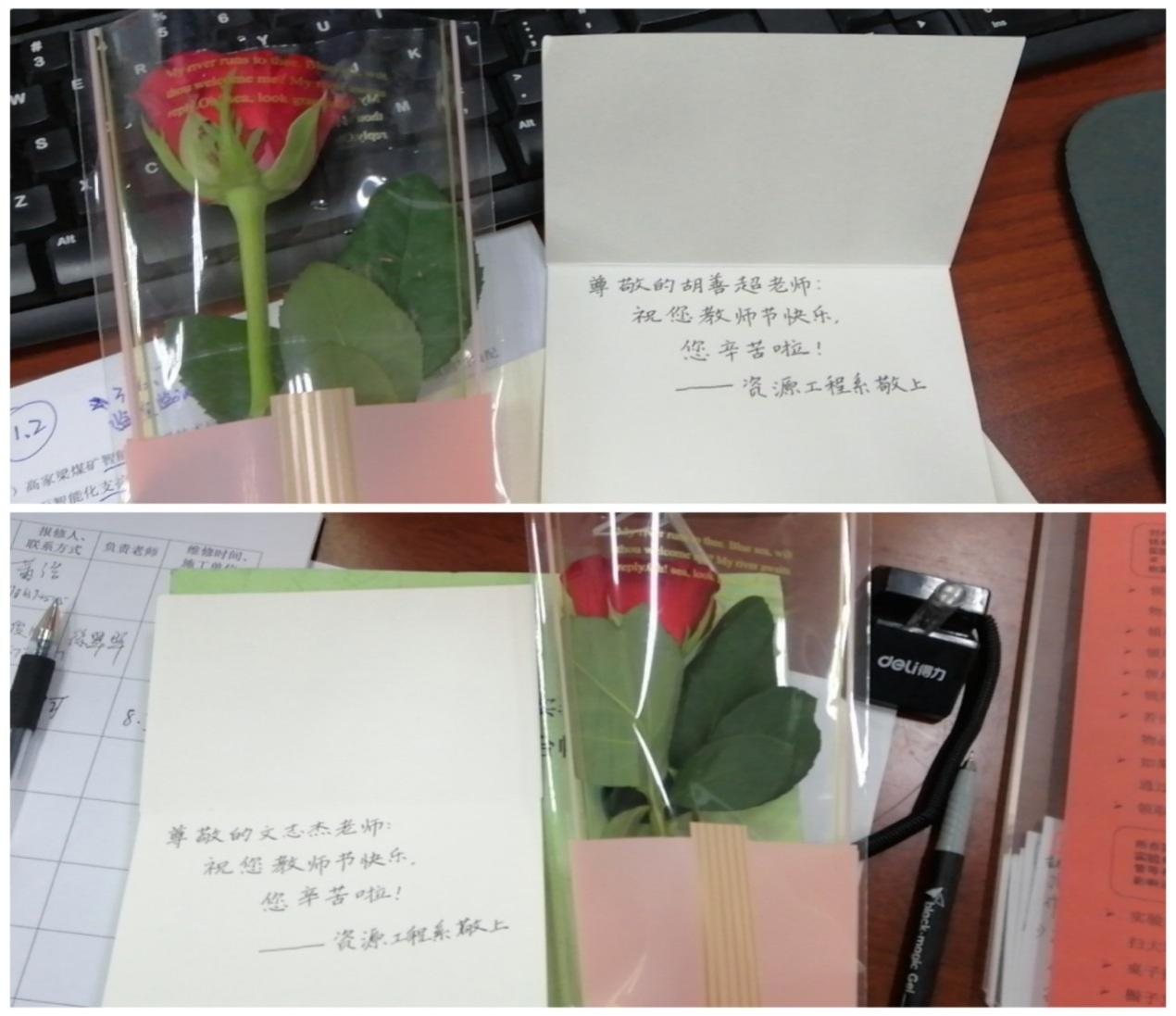 “饮其流者怀其源,学其成时念吾师”,琉璃神社 的学生们也通过送花、写贺卡、发短信等方式,向老师们表达敬意。2021级新生在军训场地,学生会各部门成员在公寓楼内,纷纷采用拍视频的方式为老师们送上“云”祝福,感谢老师们对能源学子的教诲、关怀和无私奉献。