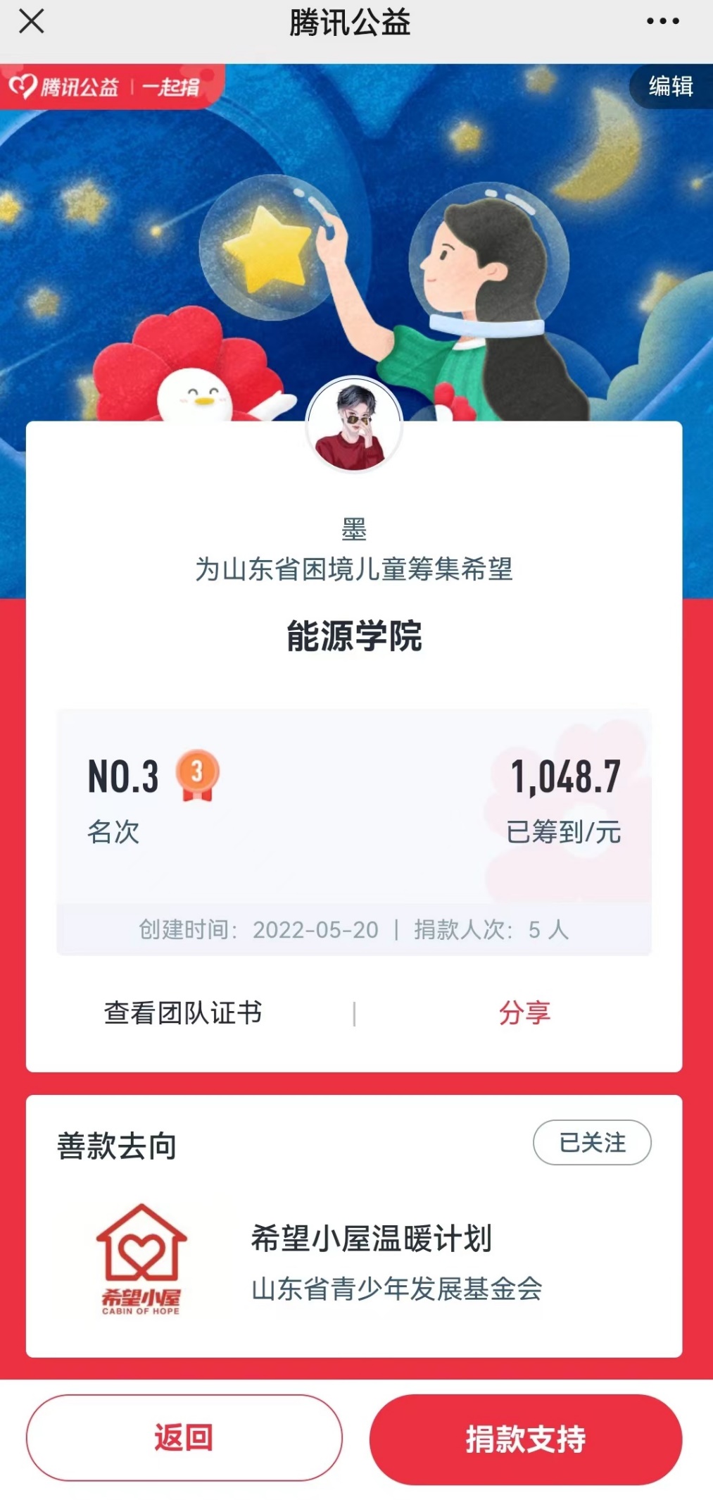 2021年5月20日至28日,琉璃神社 青年志愿者于校内开展了520公益日线上募捐宣传活动,通过“腾讯公益丨一起捐”线上平台建立琉璃神社 专属小队进行募捐,助力希望小屋儿童关爱项目。