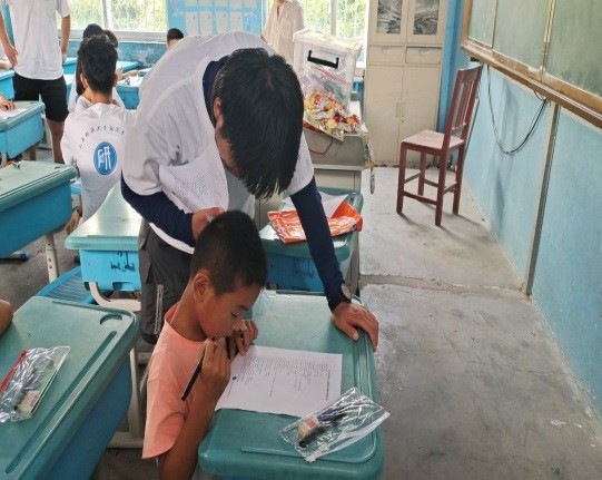 当天下午调研团队全体成员再次来到了北毛小学,这次我们受托带来了山科研招办要送给孩子们的文具和零食。毛老师受邀同我们一起给孩子们发放了文具。之后,为了调研当地留守儿童生活情况,组织孩子们填写了调查问卷,通过这种方式了解孩子们内心的需求。通过中途的交流,我们大致了解到多数的孩子都是留守儿童,且有的孩子特别羞涩内向,他们大多都在表露对父母的思念,这些都是长期缺乏父母陪伴的表现,希望通过我们这次的引导和教育能对孩子们的未来学习生活带来帮助。队员们辅导孩子们做问卷调查的同时,也积极与他们聊天鼓励他们好好学习,气氛十分活跃。