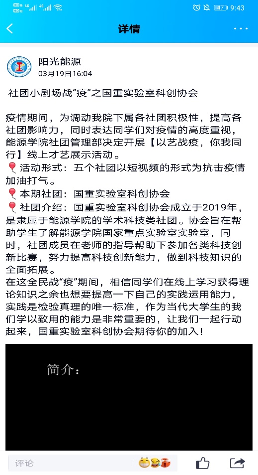 各社团通过短视频的形式,向同学们介绍社团发展、宣扬社团文化,让学生了解社团、走进社团并感受社团的特色。其中行乐社通过乐器表演,展现出同学们积极向上的精神风貌;大学生思辨社回顾以往辩论场上的精彩瞬间,让同学们仿佛置身于那唇枪舌剑的语言交锋中;棋艺社展示了各种棋类的比赛视频,严肃认真的棋手让同学们身临“棋”境;精武龙魂双截棍协会通过抖音短视频的形式,将威武霸气的双截棍与可爱呆萌的卡通人物结合,吸引了诸多同学的目光;国重实验室科创协会介绍了学院部分高端精密的实验仪器,讲解实验知识的同时激发了同学们对科研工作的兴趣。