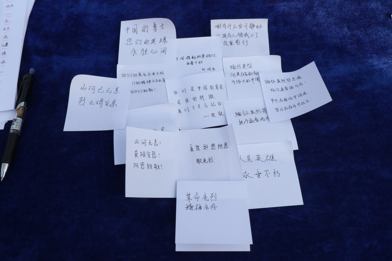 活动当天,工作人员现场准备信纸、便利贴、签字笔、展示板等物资。在庄严肃穆的气氛中,同学们用书信、绘画、手抄报、便利贴寄语等方式,表达了对革命先烈无限的思念和崇高的敬意。他们将寄语和书信按照“蜡烛”和“心形”的形式分别在展览板和工作桌上进行摆放展示,真挚地表达了新时代青年学生对革命先烈的缅怀之情,革命先烈是中华民族的脊梁、人民共和国的丰碑,将永远铭刻在我们心中。