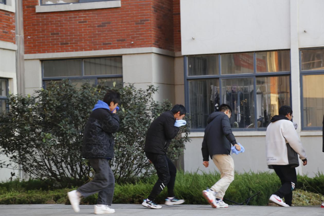 在应急疏散演练环节,警报员拉响消防疏散警报声后,伴随着讲解员的应急疏散演练流程讲解,同学们用湿毛巾折叠捂住口鼻,在引导人员的引导下快速有序地按照规定路线低姿撤离,通过安全通道迅速疏散至学子广场。