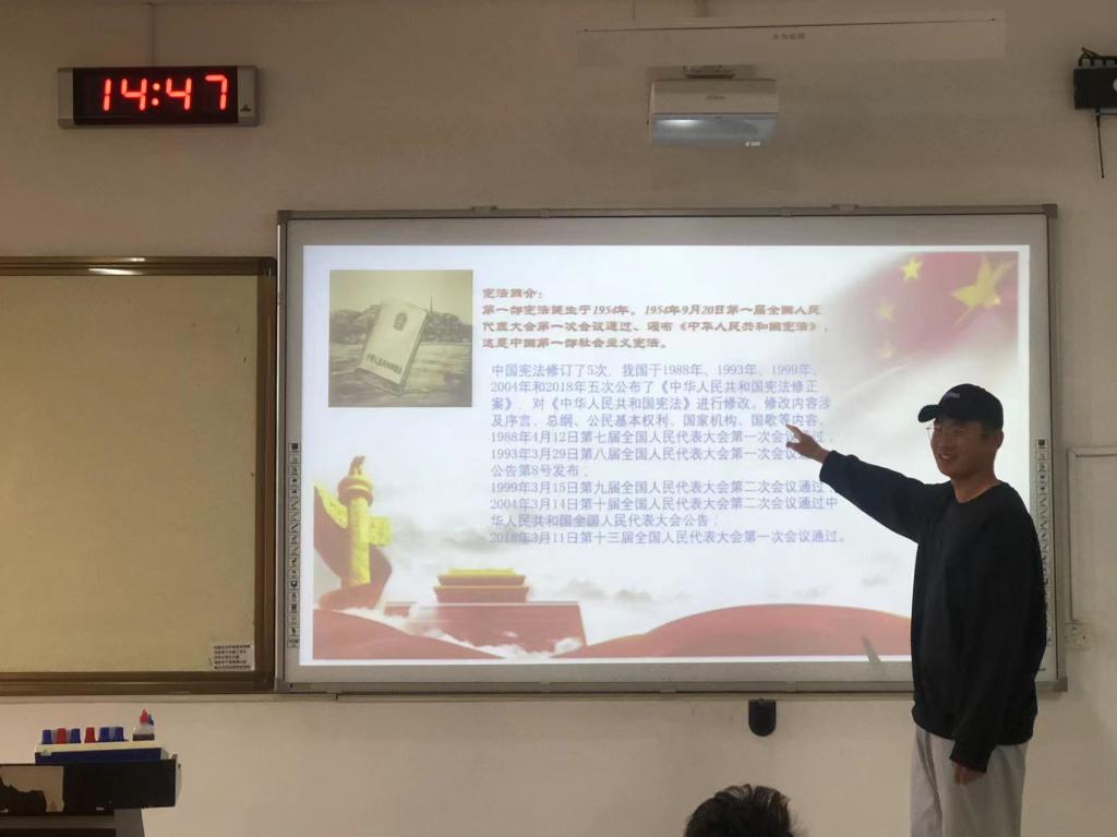 活动中,团支部书记李光强通过PPT、图片、视频和学唱宪法主题歌曲《宪法伴我们成长》等形式展开学习。介绍了宪法是国家的根本大法,它规定了国家的根本制度和根本任务,是人们行为的基本法律准则。并从“宪法为何而存”“学习宪法的重大意义”等角度对国家宪法知识进行学习宣传。同学们积极参加并表示作为一名新时代青年大学生要尊崇宪法、学习宪法、遵守宪法、维护宪法,大力弘扬宪法精神,不断增强宪法意识,使遵守宪法成为青年大学生的自觉行动,为践行社会主义核心价值观和全面推进依法治国贡献一份力量。