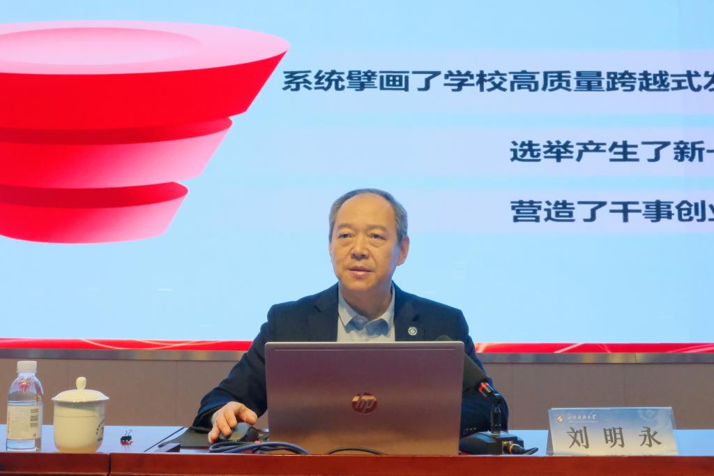 刘明永从学校第四次党代会基本情况、会议的重要意义和主要成果、会议主要精神以及确保第四次党代会精神落实见效等四个方面对学校第四次党代会精神进行了深入解读。他指出,学校第四次党代会实事求是地总结了学校第三次党代会以来取得的显著成绩和宝贵经验,深刻分析了存在的问题和面临的形势,确定了今后一个时期的目标思路和战略部署,明确了今后五年的主要任务和具体举措,对以高质量党建引领学校事业高质量跨越式发展作出了系统安排。