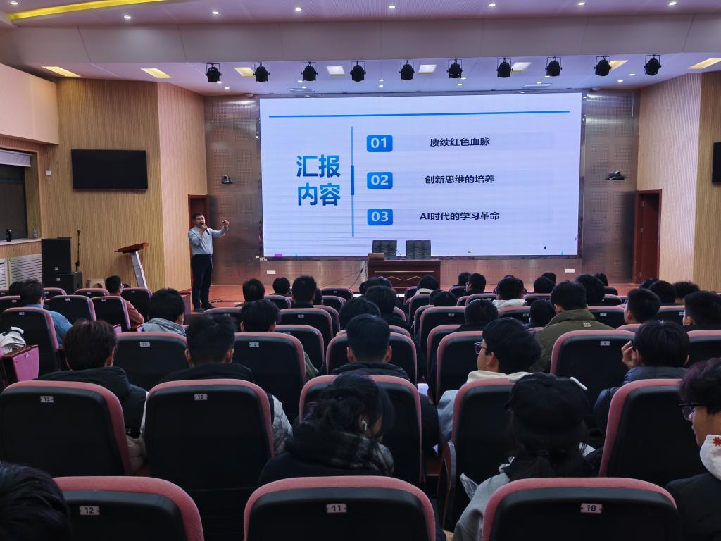 刘学生围绕三大板块开展讲座。一是“赓续红色血脉”,通过历史回溯与典型案例,梳理矿业精神谱系,讲述先辈科研故事,强调红色基因与奋斗担当的时代价值;二是“创新思维培养”,剖析行业发展挑战与机遇,提出工科创新三层次理念,倡导“X型学生”培养模式,鼓励学子突破思维局限;三是“AI时代的学习革命”,阐释了AI对矿业的颠覆性影响,分享AI工具实操技巧与高效应用方法。