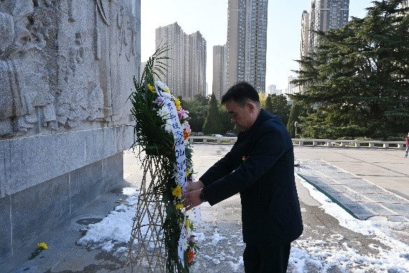 时值第12个南京大屠杀死难者国家公祭日,党委理论学习中心组(扩大)一行在郑州烈士陵园举行了庄严的缅怀仪式。在巍峨的革命先烈纪念碑前,党员代表敬献花篮,全体人员肃立垂首,为在民族独立、人民解放和国家富强道路上英勇献身的革命先烈默哀,表达深切追思与崇高敬意。学院党委书记卞西春仔细整理花篮挽联,并带领全体人员缓缓绕行,瞻仰革命先烈纪念碑。