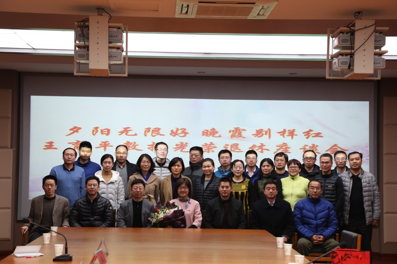 与会老师欢聚一堂、畅叙情谊。党委书记梁赛江首先介绍了王育平教授的主要工作经历及在长达35年的力学教学工作中所取得的丰硕的教学科研成果和获得的荣誉称号,号召在职教师要秉承王老师这一代人的优秀品质和艰苦创业精神,努力做一名德才兼备的教师,为学院各项事业的发展贡献自己的力量。谭云亮院长称赞了王育平教授在任教35年期间所取得的成绩,肯定了基础力学团队为提高矿业学院的教学水平及力学学科的发展做出的重要贡献,指出王教授树立了一面旗帜和一把尺子,是所有在职教师学习的榜样和楷模。两位领导代表学院向王教授光荣退休表示衷心的祝贺,并希望王老师在保养身体颐养天年的同时,常回学院看看,给以年轻人更多的教诲与支持。座谈会期间,力学系书记赵增辉老师代表力学系向王老师敬献鲜花。