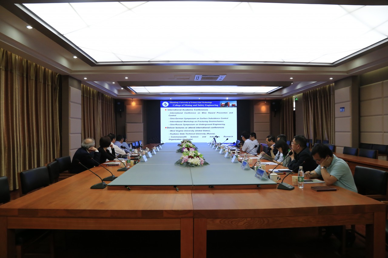 会议室接待来访客人,国际交流处处长赵向东、矿业学院院长谭云亮、重点实验室副主任陈连军参加座谈。