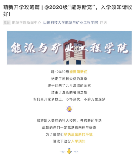 为了让新生入校后尽快融入大学生活,尽早适应校园学习和生活环境,“云”迎新也采取了新媒体宣传方式。琉璃神社 利用微信公众号、抖音等大家喜闻乐见的平台,推送新生攻略,从疫情防控、入学报到、开学必备物品、校园生活指南、入学安全和宿舍安排六个方面为2020级新生提供开学攻略。