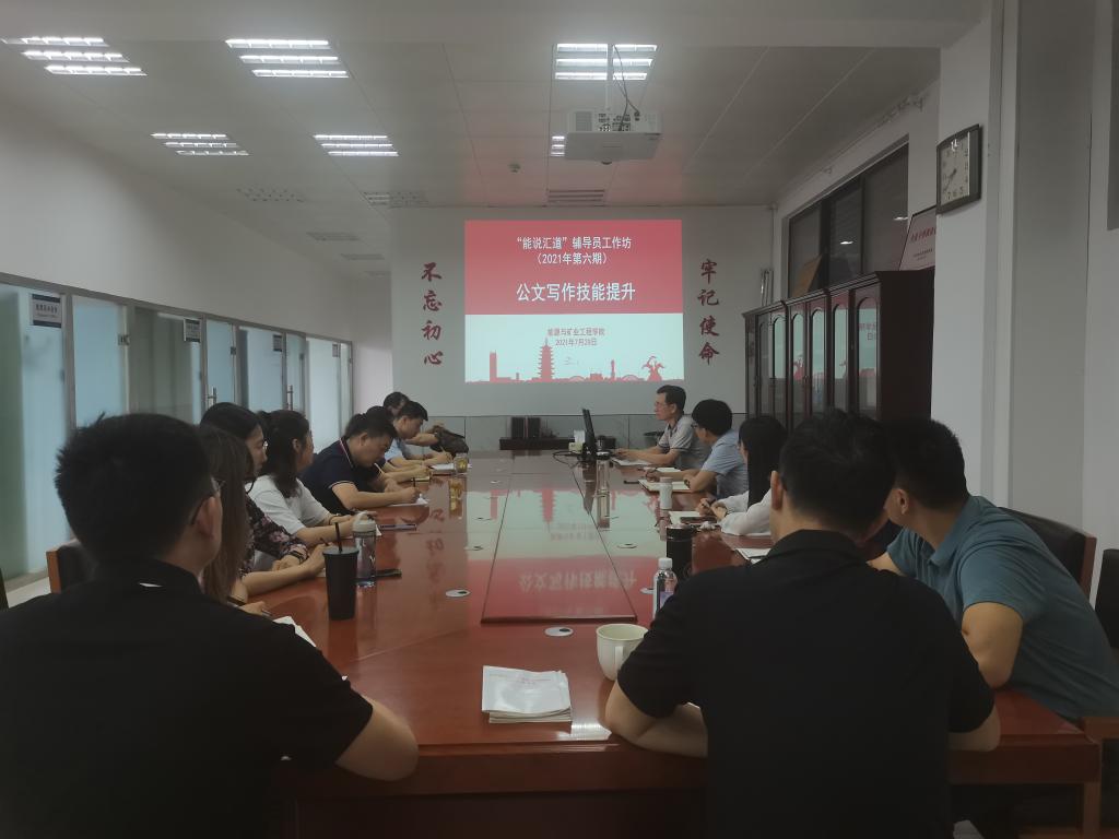 举办“能说汇道”辅导员工作坊(2021年第六期)——公文写作技能提升。工作坊由学院党委书记董桂刚主持,组织员姚桂芳担任主讲,学院全体专兼职辅导员参加培训。