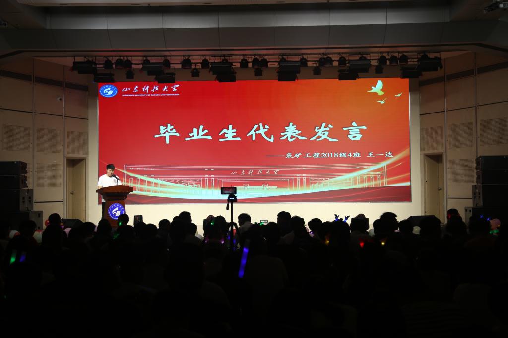 毕业生代表王一达发言。他生动形象地描述了在科大四年生活的点点滴滴,向悉心栽培他的学校、学院和老师们表达了诚挚的谢意。他表示,能源学子都要以自己的方式诠释能源精神的内涵,让科大精神和能源烙印助毕业学子展翅翱翔。他号召全体毕业生,要牢记“惟真求新”校训,成为这个时代河流中奋勇前进的搏击者,勇敢地担负起属于青年学子的使命。