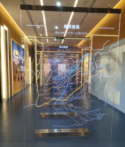 行至在黄河楼第八层“历史黄河”展厅时,团队成员了解到,雄踞黄河下游的滨州市,历史悠久,是黄河文化和齐文化的发祥地之一。自古以来,黄河治理一直是中华民族与自然和谐共生的千古命题和兴邦安民之大事。这里记录了黄河闻名于世的重大改道6次。我们通过叠加的半透明展屏,了解了历代黄河河道变迁的过程。