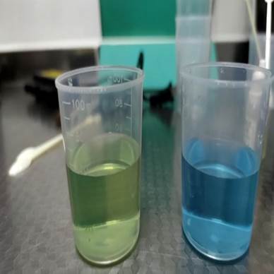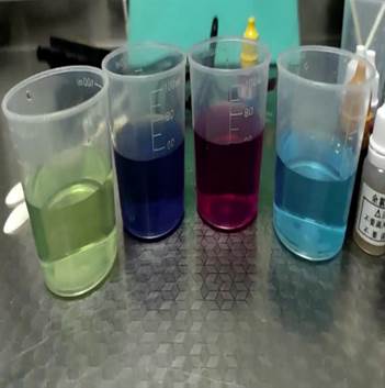 然后为我们介绍了试剂的使用主要有两种方法,一种是加入摇匀,另一种是加入观察褪色情况。首先是PH试剂的使用,分别向装有纯净水和自来水的烧杯中滴入一到两滴PH试剂,观察两杯水的颜色变化,再根据比色卡查找对应PH,明显看出纯净水是偏酸性,自来水是偏碱性。