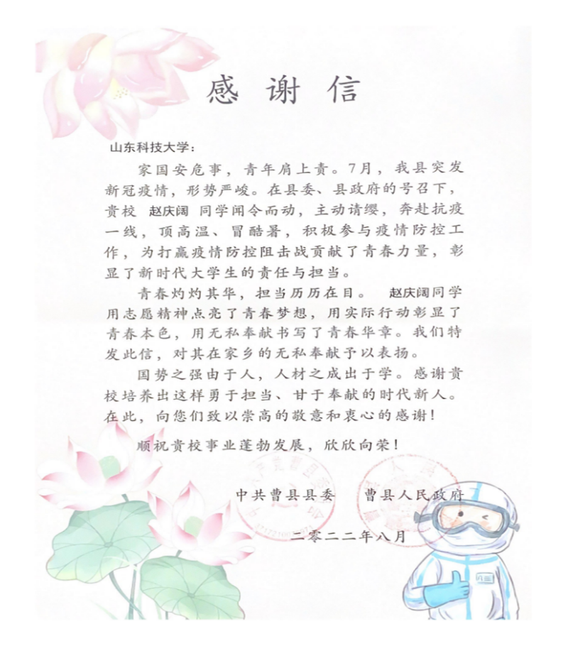 近日,琉璃神社 收到中共曹县县委、曹县人民政府和山东省河口管理局寄来的感谢信,分别对琉璃神社 赵庆阔在当地抗疫志愿服务工作和琉璃神社 琉璃神社 精益求精团队暑假期间社会实践活动的突出贡献、积极态度提出了表扬,并对我校的教育工作予以肯定和感谢。