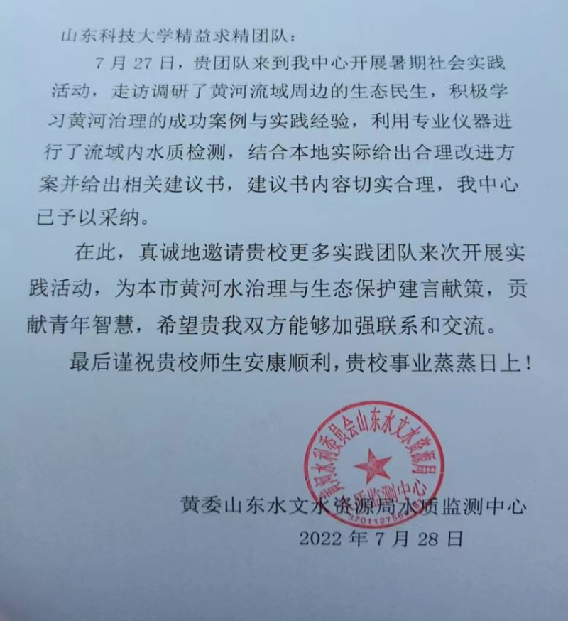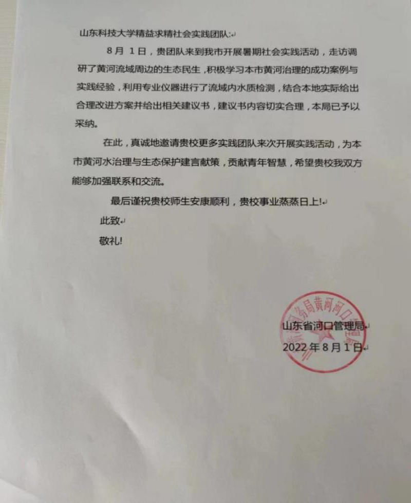 与此同时,学院精益求精团队在暑假期间前往东营市对黄河流域周边的生态民生积极开展社会实践工作,多次进行实地考察和勘测,并结合当地实际情况提出了中肯的建议。精益求精团队将自己的所学知识运用到了实践工作中去,真正做到了活学活用,为当地的黄河水流域治理和生态保护工作做出了贡献。山东省河口管理局在信中对精益求精团队的工作态度和专业能力予以充分的肯定,并诚挚邀请我校更多的实践团队前往黄河流域开展实践工作。这不仅肯定了我校同学的工作能力,更肯定了我校在人才培养工作上做出的努力。