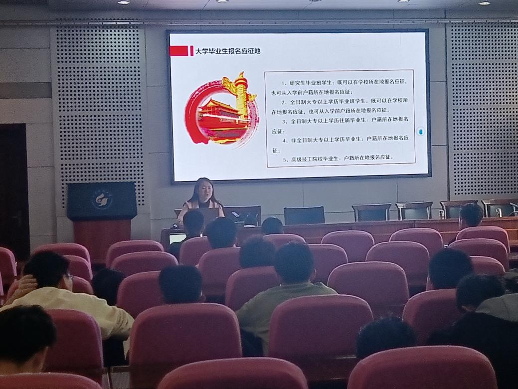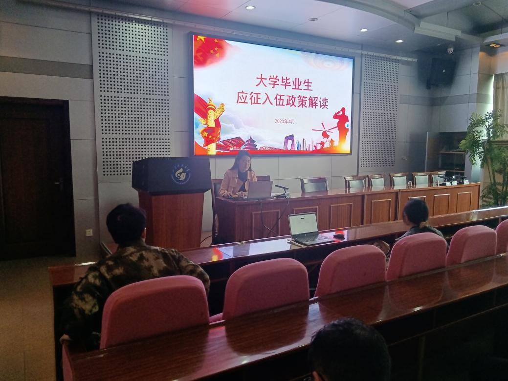 于喆老师对今年的征兵政策进行解读和介绍,主要针对报名时间及报名方式、参军入伍基本条件、参军入伍程序、参军入伍“五笔账”、大学生参军入伍优惠政策等部分展开介绍。