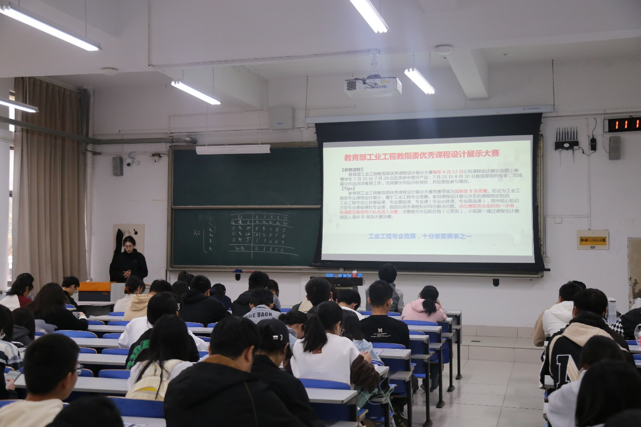 宋淑环向同学们介绍了“互联网+”大学生创新创业比赛、MathorCup数学建模大赛等提升专业素养的学科竞赛。她以工业工程应用案例大赛为例,从个人参赛经历出发,通过展示竞赛中的实际案例,讲解了比赛概况、前期准备和软件使用等相关内容。在与同学们的交流中,她鼓励同学们积极参与科创比赛,提高自己的实践和创新能力,并针对同学们关心问题进行深入交流。