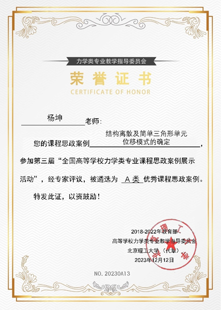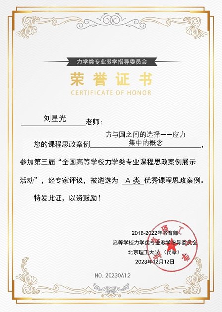 近日,教育部高等学校力学类专业教学指导委员会公布了第三届“全国高等学校力学类专业优秀课程思政案例展示活动”优秀课程思政案例的遴选结果。我校力学系陈俊国、杨坤和刘星光三位老师报送的三项案例均获评A类优秀课程思政案例。这是我校继去年获评两项A类优秀案例之后,取得的又一佳绩。