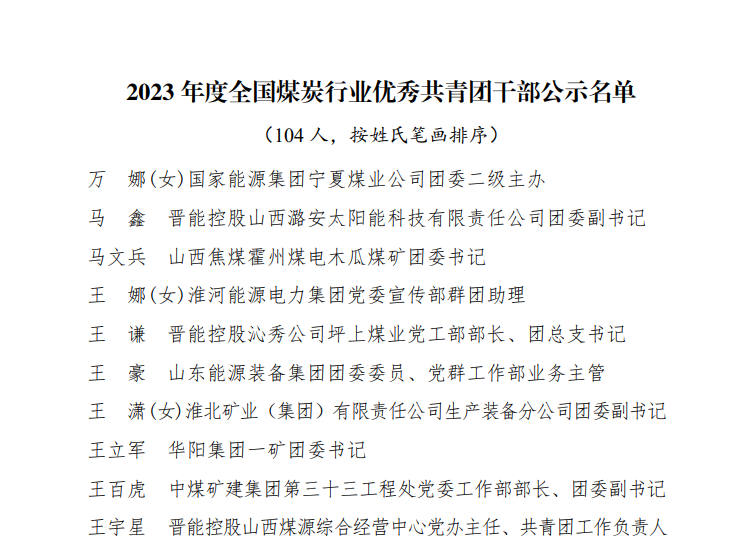 全国煤炭青年五四奖章是全煤团指委授予煤炭行业优秀青年的最高荣誉。根据《“全国煤炭青年五四奖章”评选表彰办法(试行)》《全国煤炭行业五四红旗团委(团支部)、优秀共青团员、优秀共青团干部评选表彰工作办法(试行)》要求,经各企事业单位申报、全煤团指委秘书处初评、主任委员会议评审,共有20名同志获得第12届“全国煤炭青年五四奖章”,104名同志获得“2023年度全国煤炭行业优秀共青团干部”称号。(通讯:柳慧敏 责编:陈爽 审核:许琳)