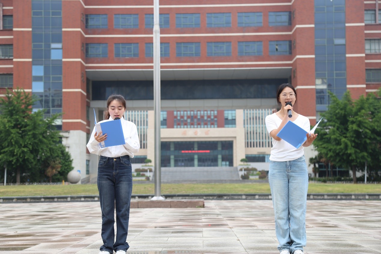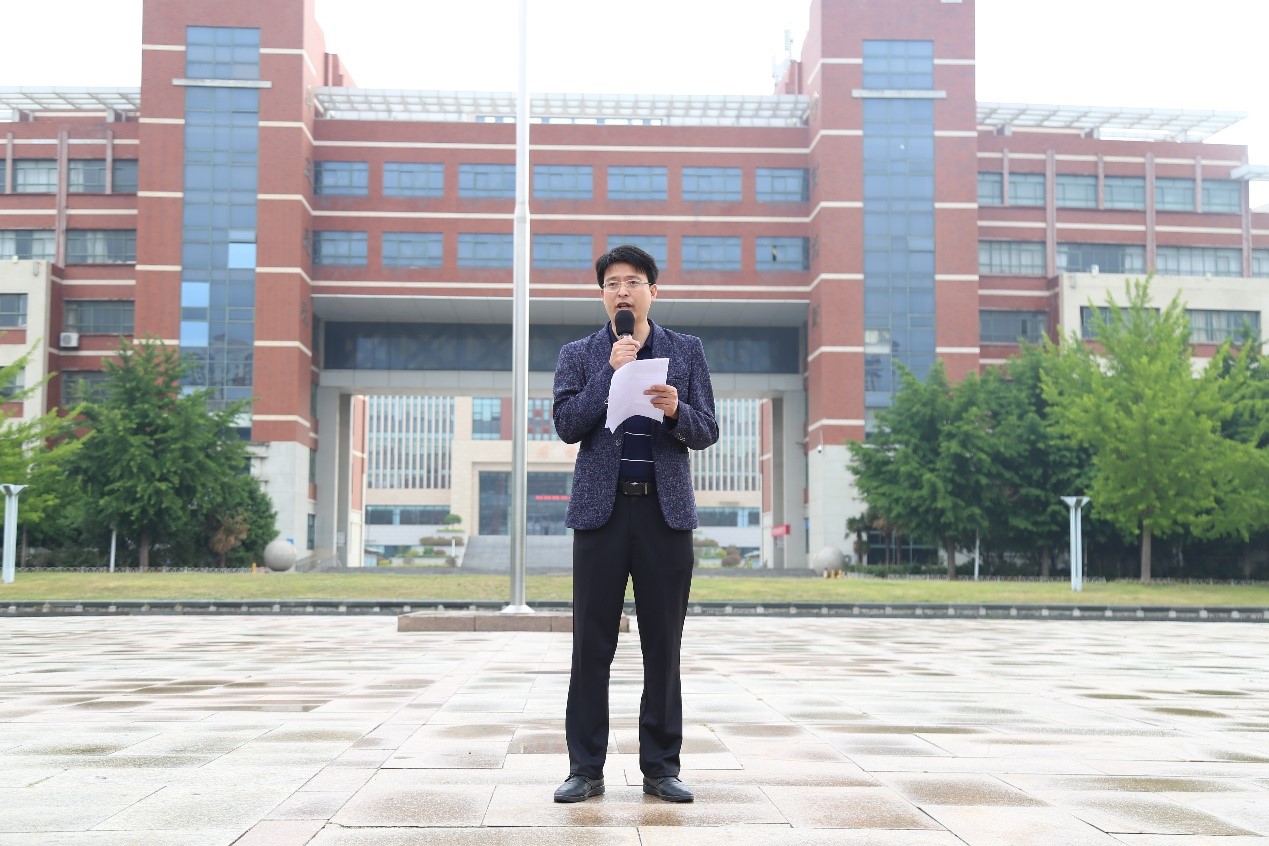 国旗护卫队迈着整齐有力的步伐,护旗而出,昂首走向升旗台。升旗仪式在庄严的国歌声中拉开序幕,鲜艳的五星红旗在全场目光的注视下缓缓升起,迎风飘扬。全体师生肃立敬礼,高唱国歌。升旗仪式后,学生代表王世一、蔡佳艺在国旗下作《祖国啊,我的祖国》主题宣讲,鼓励青年学子敢于担当,为中华民族的伟大复兴而坚强自立,坚持梦想,勇往直前。周尚涛宣读“百万大学生进社区”社会实践倡议书,号召广大学生用实际行动弘扬“奉献、友爱、互助、进步”志愿服务精神,在社会实践中检验所学、增长本领、扩大视野、增长才干。辅导员肖宜辉发表国旗下的讲话,鼓励广大青年励志做好新时代的“筑梦人”“追梦人”和“圆梦人”,用青春的热情和汗水书写人生的华章。