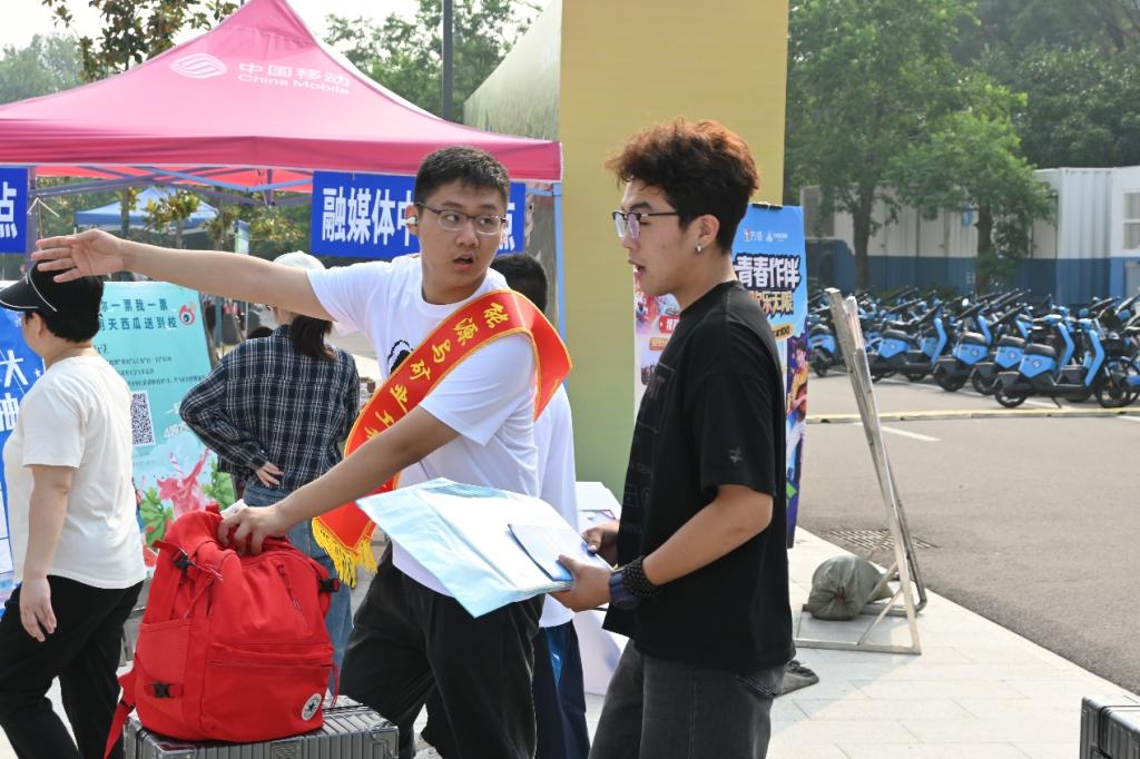 迎新现场,在辅导员老师的组织指导下,新生入学手续有序办理。系主任等骨干教师现场指导答疑。学院学生会、高年级班级组织了充足的迎新志愿者,带领新生核验信息、发放资料,帮助新生搬运行李,引导新生熟悉校园环境。
