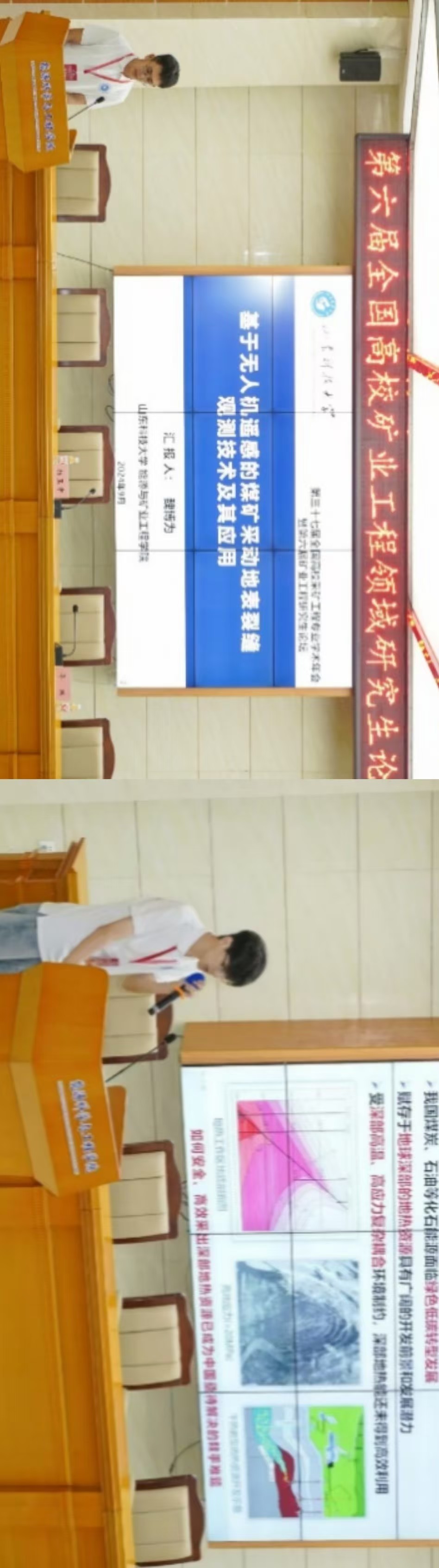 学院选送的学生实践作品涵盖了采矿技术创新、环境保护与资源综合利用等多个方面,学校获奖数量和获奖层次均列参赛高校前列。此外,在矿业工程领域研究生论坛上,学院硕士生宋士龙作“实时高温下花岗岩节理剪切力学性能及节理面损失特征研究”、硕士生魏博为作“基于无人机遥感的煤矿采动地表裂隙观测技术及其应用”的报告。