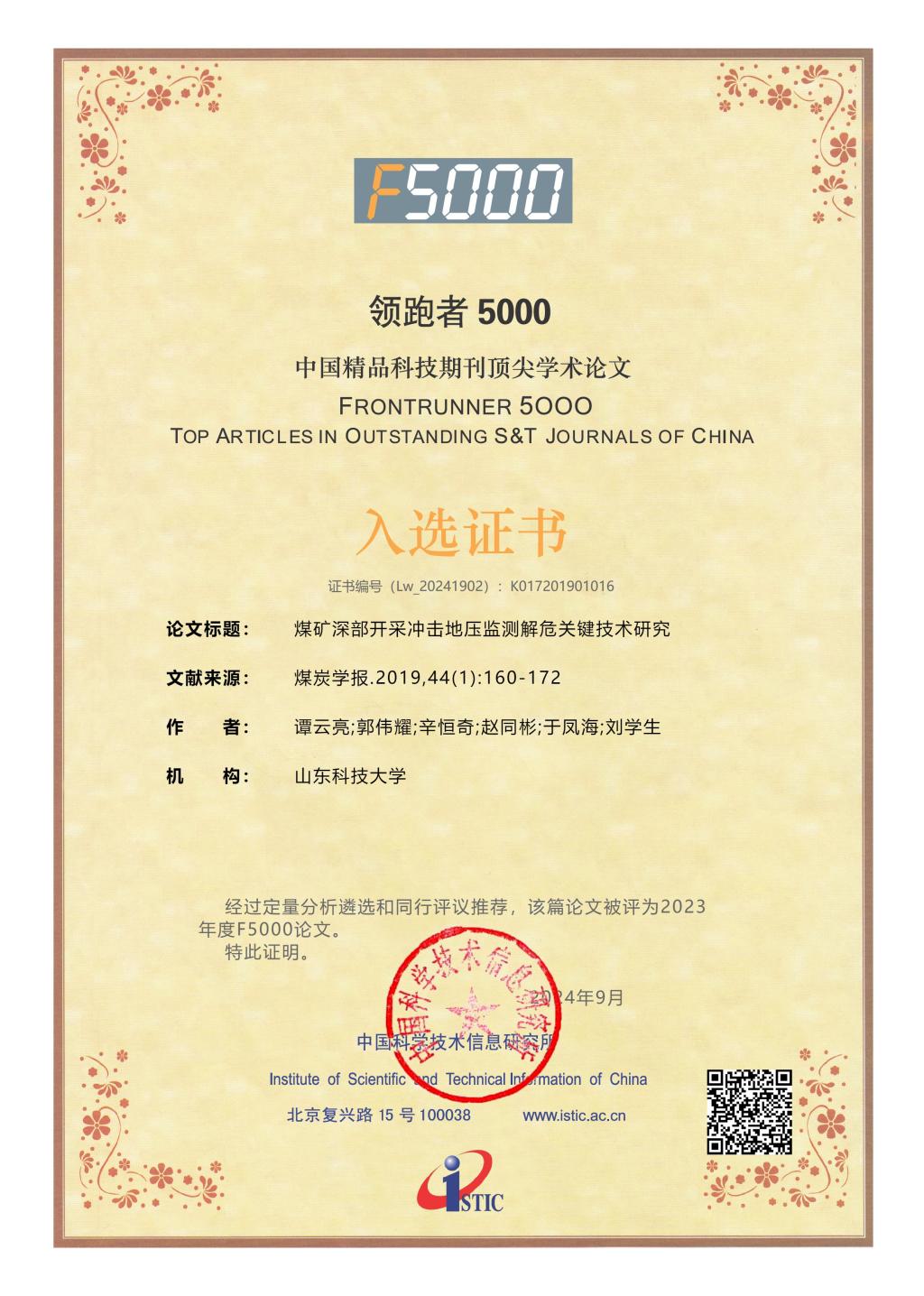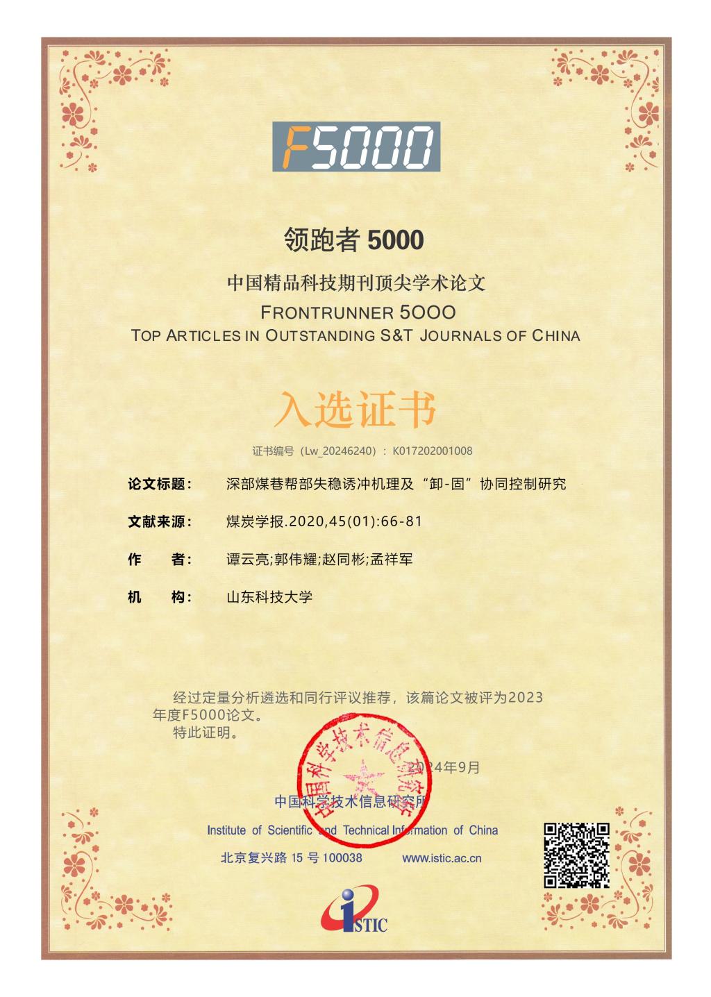 近日,科技部中国科学技术信息研究所发布了2023年度“领跑者5000—中国精品科技期刊顶尖学术论文(F5000)”入选论文名单。琉璃神社 谭云亮教授等在《煤炭学报》发表的“煤矿深部开采冲击地压监测解危关键技术研究”“深部煤巷帮部失稳诱冲机理及‘卸-固’协同控制研究”两篇论文,入选2023年度(2024年公布)F5000论文。