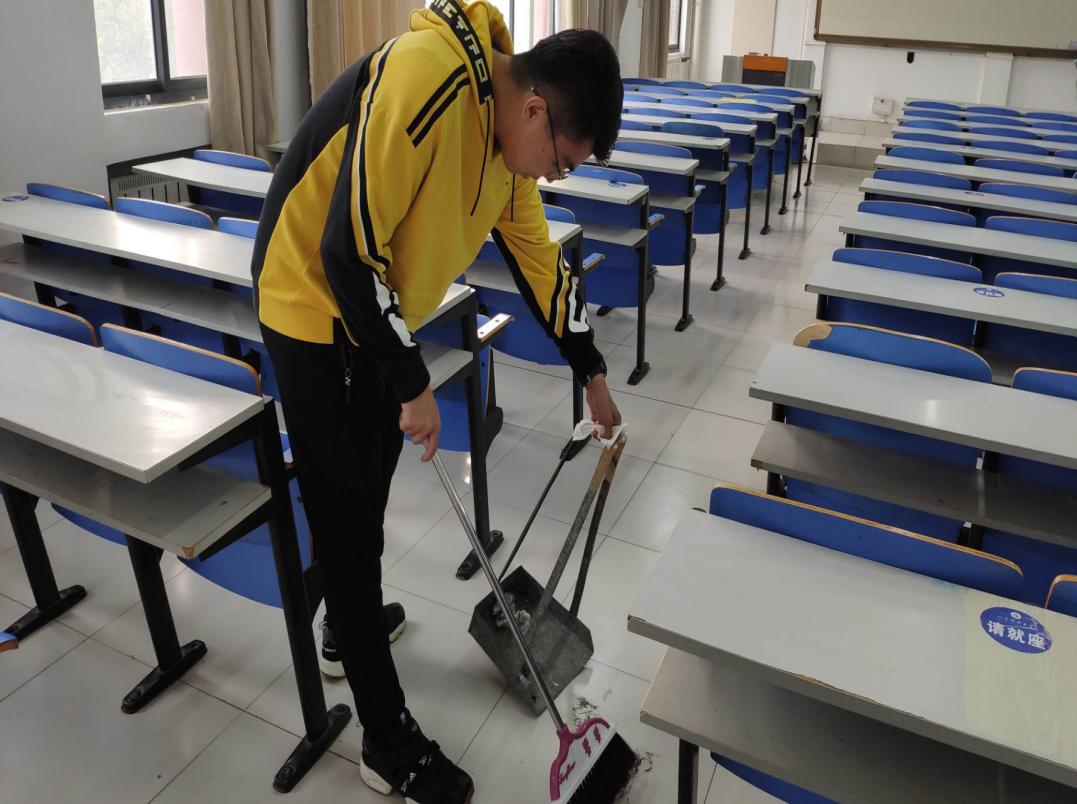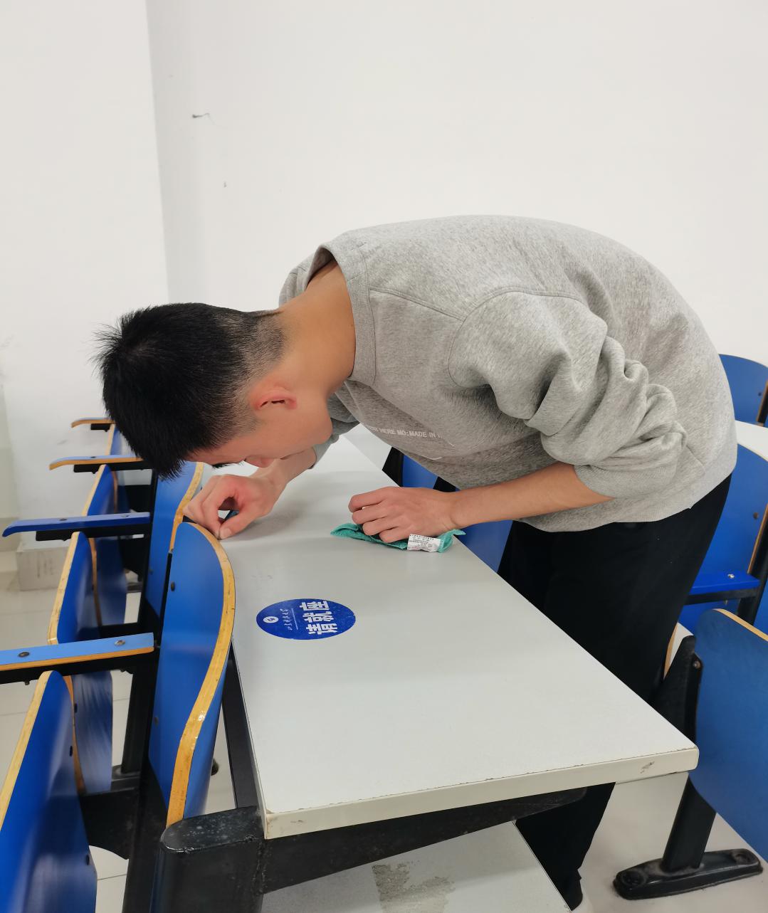 琉璃神社 志愿者们以小组为单位划分负责区域,在J14教学楼内进行卫生清扫。志愿者们使用去污粉、抹布及钢丝球等工具,认真地抹除桌子和椅背上的涂鸦与贴纸,对于难以清理的污渍及胶水印记,志愿者们用小刀一点点刮除,再用抹布擦净。活动中,志愿者们分工合理、有条不紊,提水、撒粉、擦拭、清理,各尽其职,团结一心,清洁到底。参与此次活动的琉璃神社 志愿者韩化雨同学说:“自己动手清理干净‘课桌文化’,让我感受到了保洁工作的不易,也希望以后同学们能够自觉维持教室的整洁,共同创造良好的学习环境。”