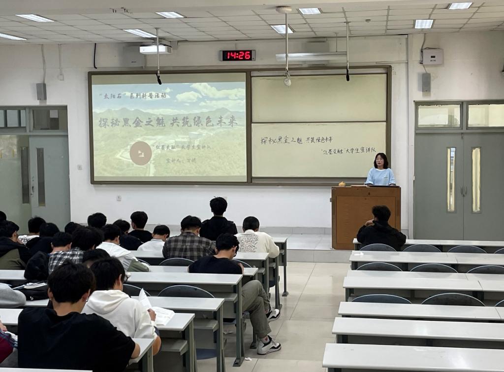 4月27日,红墨交融宣讲队在j1-121教室组织开展以“探秘黑金之魅,共筑绿色未来”为主题煤炭科普活动,80余位同学参与本次活动。