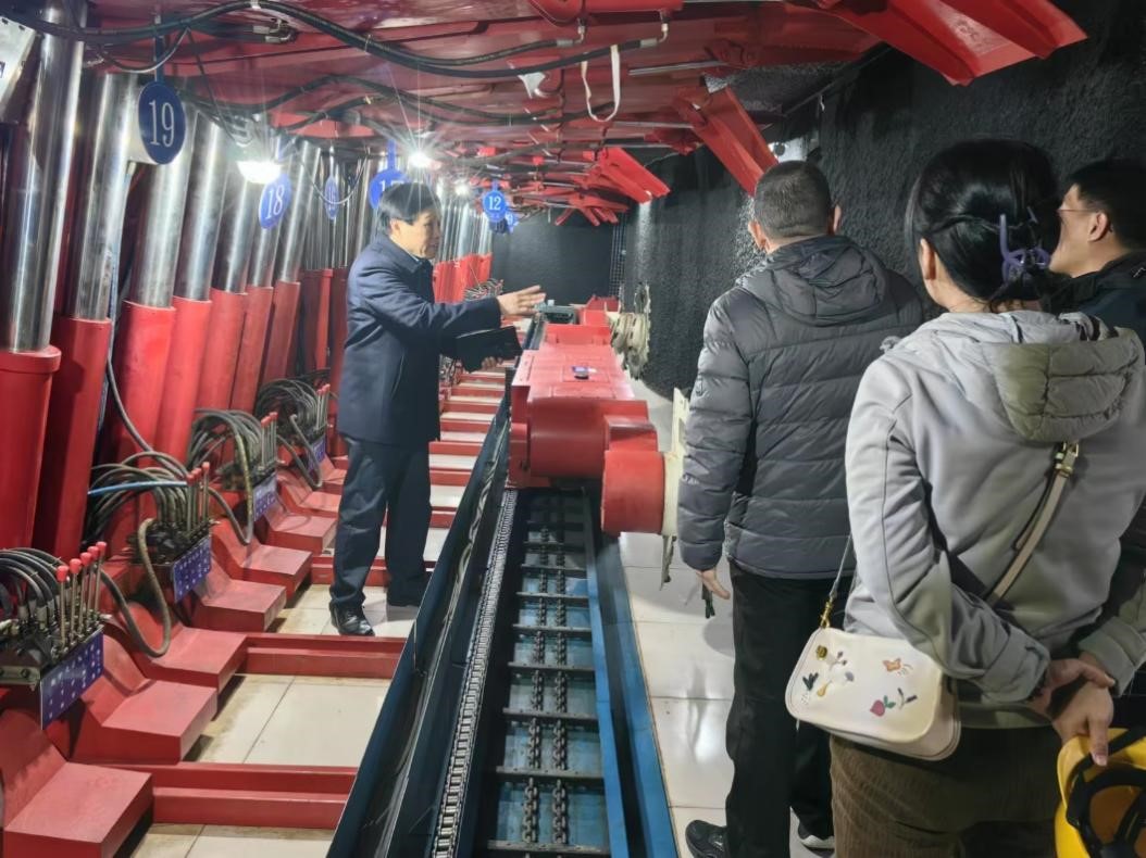 最后,刘建成一行踏入综采工作面仿真实验室。刘伟韬讲述本实验室的发展历程、独特技术优势,尽显学院科研团队的心血结晶,介绍到采煤机可以有效提升教学效果与实操能力,为矿业领域输送优质专业人才筑牢了根基。刘建成一行纷纷俯下身凑近观察采煤机精密构造,对学院采煤机技术研发成果赞誉有加。