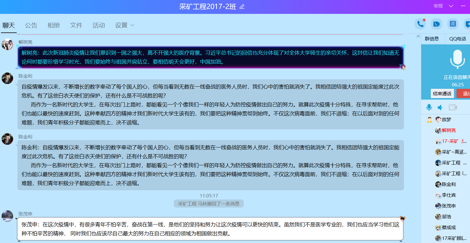 采矿工程2017-2班向恭梁说:“习近平总书记重要回信精神充分体现了习近平总书记和党中央对广大医务工作者的赞誉与关怀,同时也饱含着对我们广大青年学子的殷切期待。强化自身本领,努力学习知识,到祖国需要的地方去,是能源学子不变的信念,作为一名即将进入毕业年级的大三学生,我明白此时我正需要扎实练就本领,努力学习专业知识,用自己的本领来服务群众,服务社会,服务国家。”