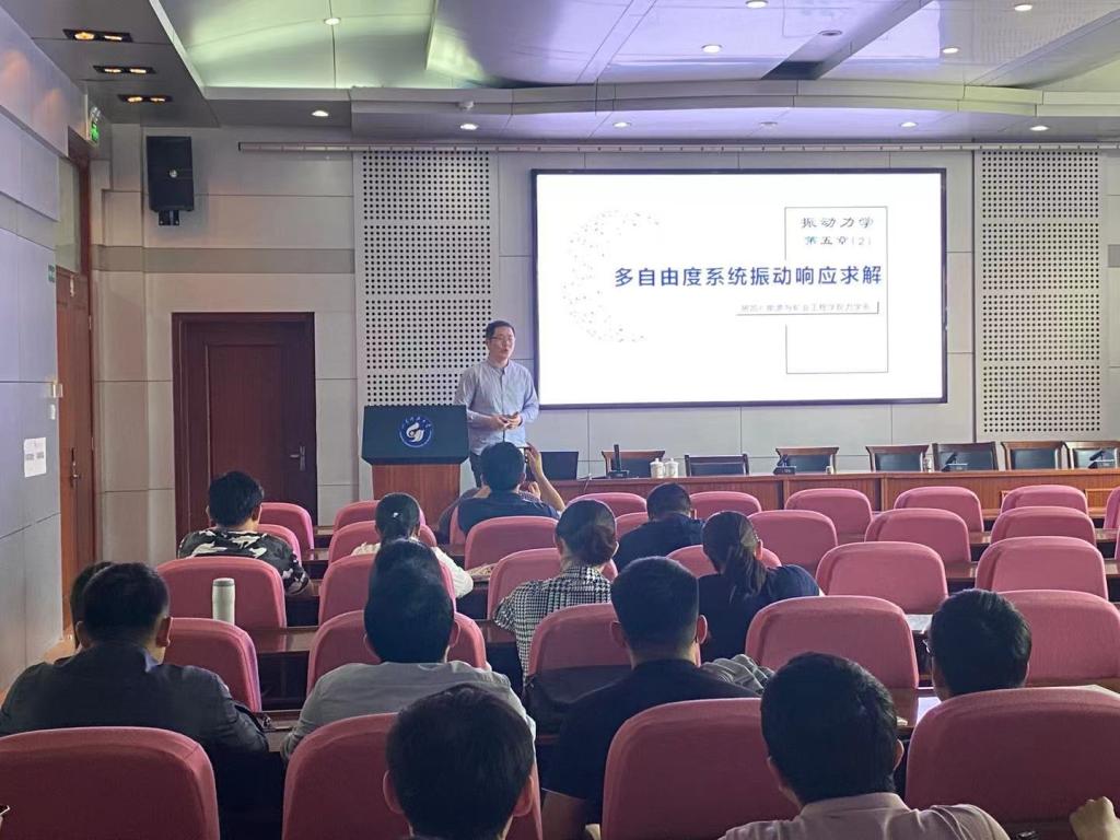 房凯老师选取了《振动力学》第五章的部分节段内容,主要讲述了多自由度系统自由振动方程的求解方法,通过主振动特解的引入,讲解了利用正交主阵型实现方程解耦和过程,并通过对矩阵的变换原理的阐述,从数学层面深入阐述了利用对称矩阵对角化进行解耦求解的本质。房凯老师课堂内容丰富、结构紧凑、逻辑清晰,讲解节奏迟缓有度,受到了观摩教师的高度认可。